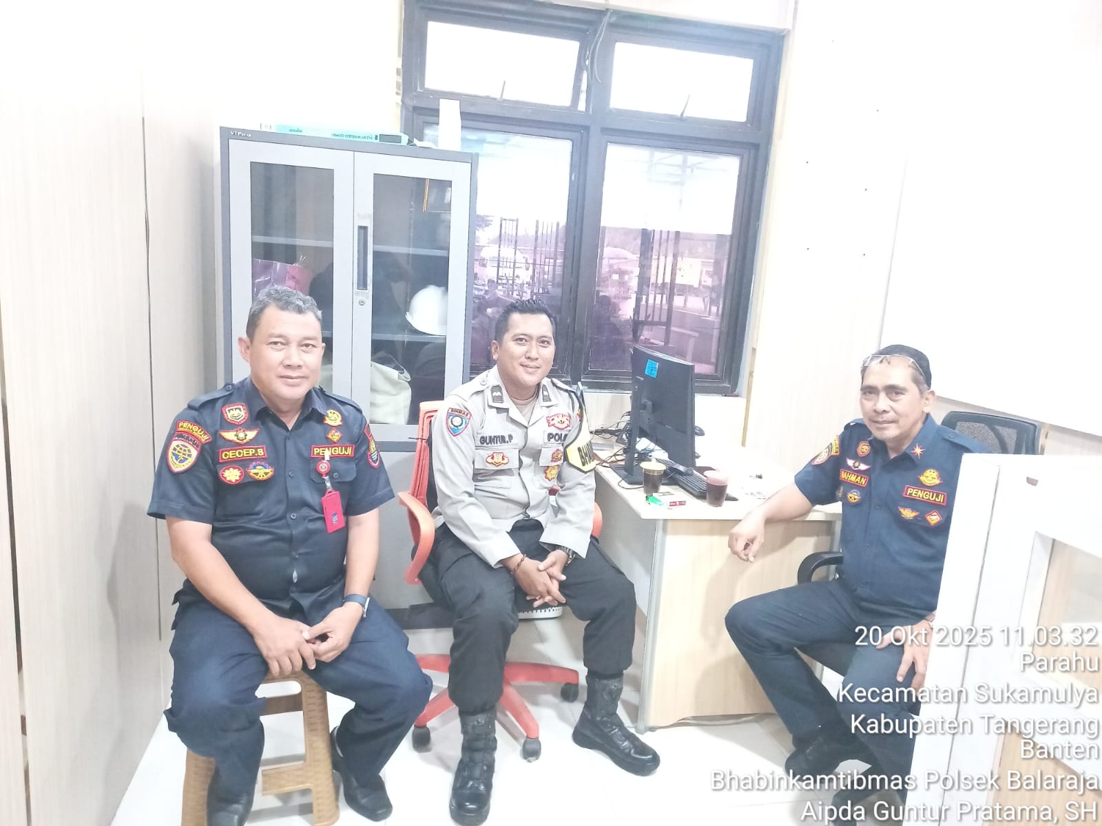 Kriminalxpost.com || TANGERANG – Guna meningkatkan komunikasi situasi dan kondisi yang ada di Desa, Bhabinkamtibmas Polsek Balaraja Aipda Guntur Pratama SH melaksanakan giat Preemtif dan Sambang DDS kepada Bpk Rahman dan Cecep selaku Penguji di Kantor Dishub Pengujian Kendaraan bermotor Dishub Balaraja Desa Perahu Kecamatan Sukamulya Kab. Tangerang. Senin (20/10/2025).