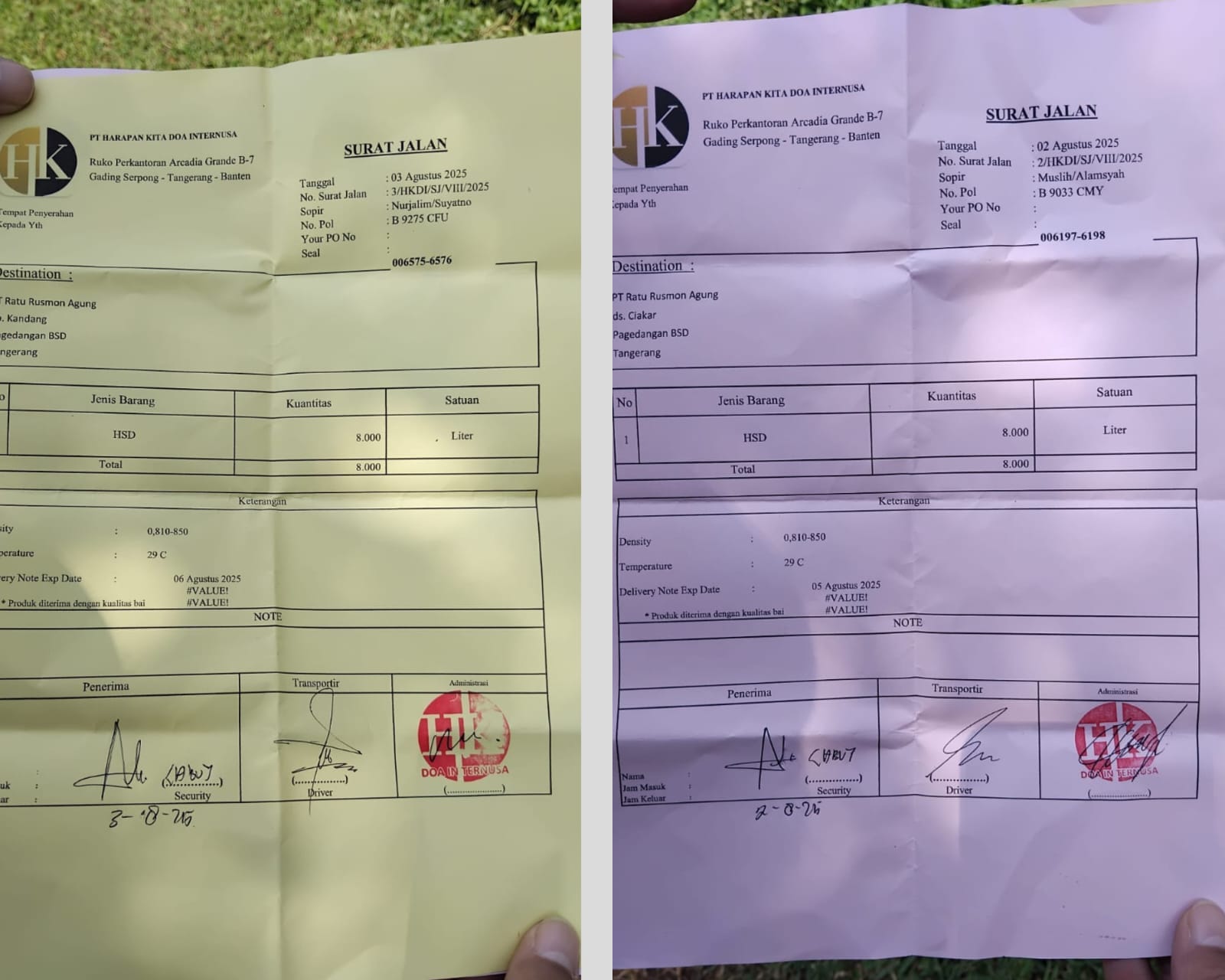 Saat dikonfirmasi Slamet yang mengaku sebagai pengurus dari PT HK (Harapan Kita Doa Internusa) mengatakan Solar yang kami kirim dari serang dan itu resmi solar Industri melalui telpon seluler (whatsapp) Selasa, 05/08/2025
