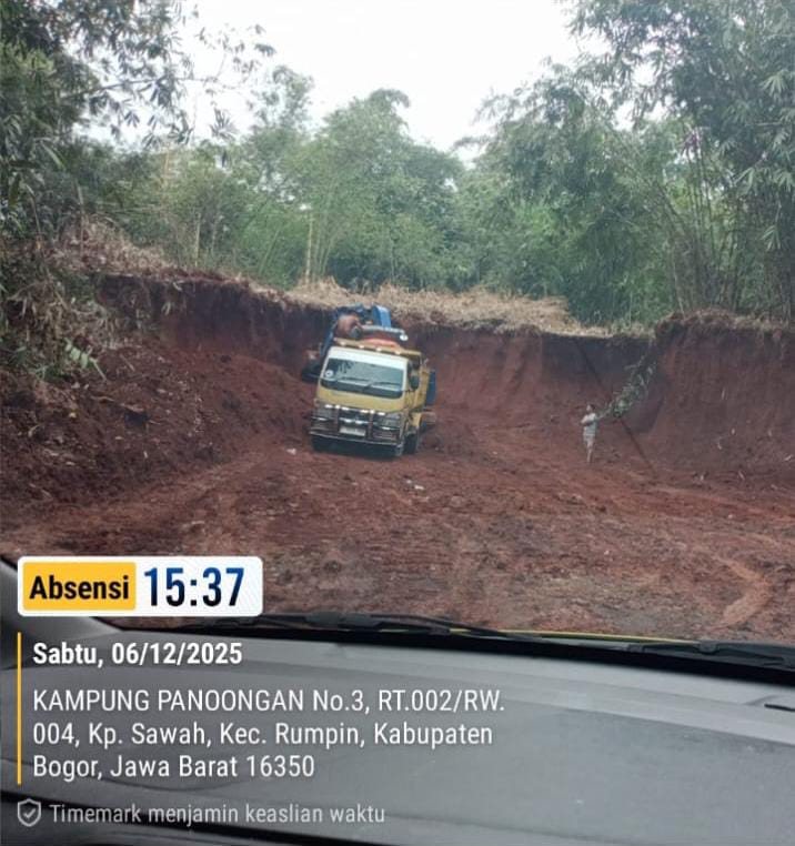 Kriminalxpost.com||Bogor – Aktivitas tambang galian tanah yang diduga tidak mengantongi izin kembali ditemukan beroperasi di kawasan Panoongan RT 002/004, Kampung Sawah, Kecamatan Rumpin, Kabupaten Bogor, pada Sabtu (06/12/2025). Temuan ini sangat disayangkan, sebab sebelumnya Polisi Pamong Praja (Pol PP) Kecamatan Rumpin telah memberikan surat peringatan penghentian aktivitas pada Jumat (28/11/2025).