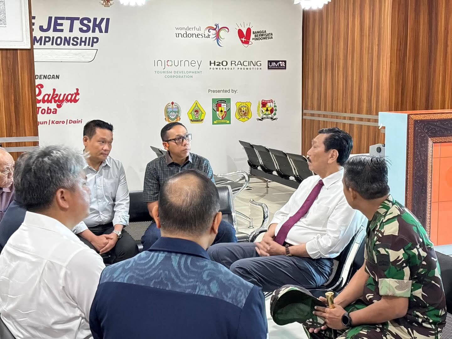 Bupati Tapanuli Utara Dr. Jonius Taripar Parsaoran Hutabarat (Dr. JTP), S.Si., M.Si bersama Wakil Bupati Dr. Deni Parlindungan Lumbantoruan, ST., M.Eng menyambut kedatangan Ketua Dewan Ekonomi Nasional (DEN) Luhut Binsar Pandjaitan di Bandara Internasional Silangit, Kecamatan Siborong-borong, Minggu (23/11/2025).