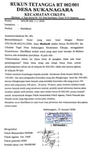 Saya Sahan, Menyampaikan dan meluruskan juga menanggapi perkataan bapak Ketua RT Shuhardi terkait Dana Desa dipangkas di penulisan proposal yang sebelum nya dan yang sebenarnya dana desa itu ada tapi untuk di tahun 2026 ini tidak ada untuk pembangunan di wilayah RT 02 RW 01 kp Cibadak Tegal dan untuk dana desa itu di alihkan ke wilayah RT yang lain maka dari itu saya meluruskan sekali lagi kepada sosmed karena bikin gaduh dalam proposal yang ditulis oleh Ketua RT 02 itu bukan tidak ada dana desa dan itu ada tapi untuk tahun ini buat pembangunan di RT lain dan sekali lagi apabila dalam penulisan proposal tertulis memungut biaya 150 atau 250 itu mohon maaf yang sebesar-besarnya atas kegaduhan yang dibuat oleh Pak RT dalam penulisan proposal Mungkin itu saja dari kami untuk meluruskan penulisan proposal pak RT 02 cukup sekian dan Terima kasih. ujar Sahan