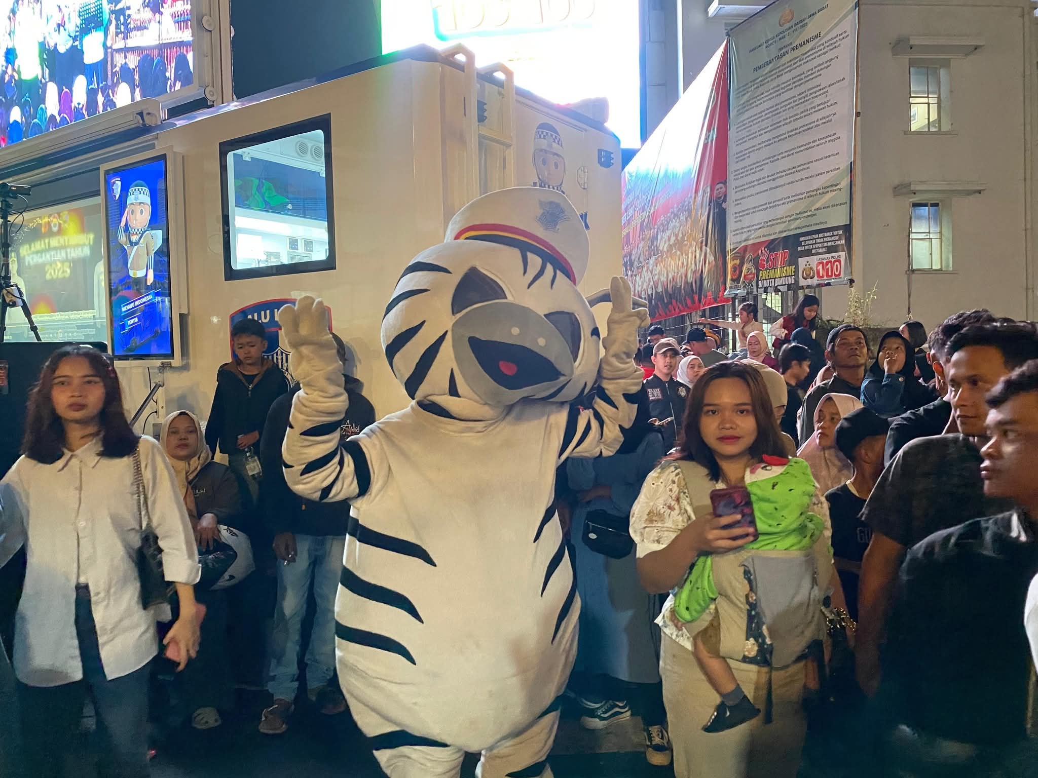 Kriminalxpost // Bandung, 31 Desember 2025 – Dalam rangka memberikan rasa aman sekaligus menghadirkan suasana yang humanis dan menghibur bagi masyarakat pada malam pergantian Tahun Baru, Polda Jawa Barat menghadirkan boneka atau maskot lalu lintas (Lantas) di sejumlah titik keramaian di Kota Bandung tepatnya di jln Asia Afrika , Rabu (31/12/2025).