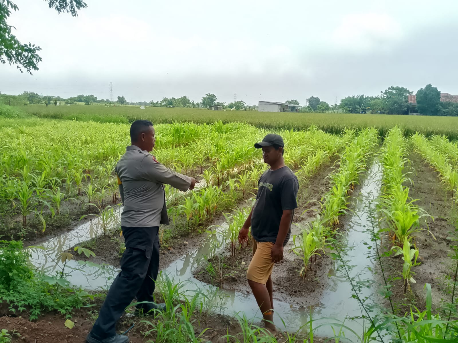 Adapun lahan pertanian yang dikelola Poktan Mukti seluas kurang lebih 5.000 meter persegi dengan komoditas tanaman jagung hibrida. Dari hasil pengecekan, diketahui tanaman jagung berusia sekitar satu setengah bulan, namun mengalami perubahan warna daun menjadi kuning akibat terdampak genangan banjir.