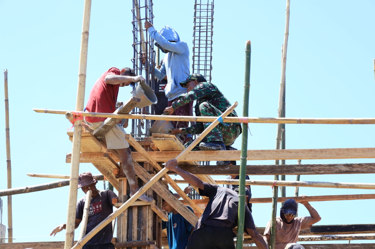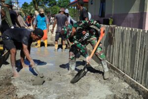 Menariknya, bukan hanya kaum pria yang terlibat dalam pekerjaan ini, para ibu-ibu juga ikut ambil bagian dalam kegiatan pengecoran tersebut. Mereka dengan sigap membantu menyiapkan air dan mengangkat campuran semen. Pemandangan tersebut menjadi bukti nyata kuatnya rasa kebersamaan antara TNI dan rakyat.