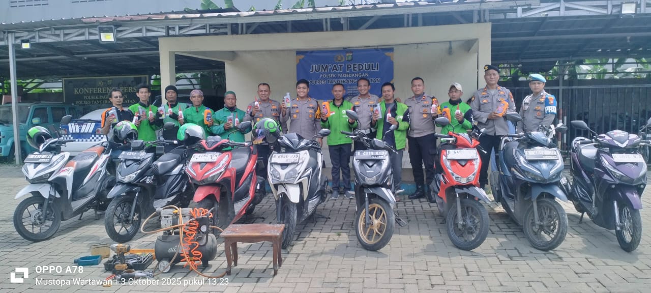 KRIMINALXPOST.COM||TANGERANG – Kapolsek Pagedangan, Polres Tangsel AKP Galan Adid Dharmawan,S.T.K.,S.I.K., bersama jajaran pada Jumat 03 Oktober 2025 seusai sholat Jumat melaksanakan indahnya berbagi lewat mengantikan oli mesin dan oli gardan untuk pengemudi roda dua ojek online (OJOL).