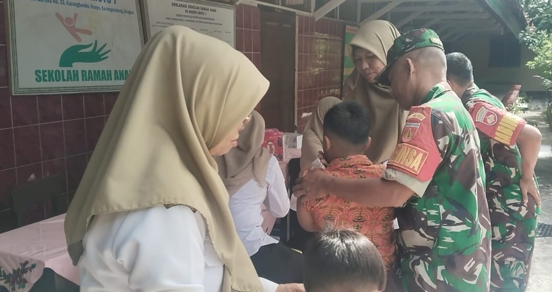 Kriminalxpost.com || Sragen – Dalam rangka mendukung Kesehatan anak, Serka Sugito Babinsa Kel. Kroyo bersama dua orang anggota Koramil 02/Karangmalang Kodim 0725/Sragen turut hadir dalam kegiatan Imunisasi Bulan Imunisasi Anak Sekolah (BIAS) yang dilaksanakan di SDN 1 Kroyo, Kecamatan Karangmalang. Kehadiran Serka Sugito tersebut bertujuan memberikan dukungan dan membantu kelancaran kegiatan imunisasi yang dilakukan oleh petugas kesehatan Puskesmas Karangmalang, Kamis (13/11/2025).