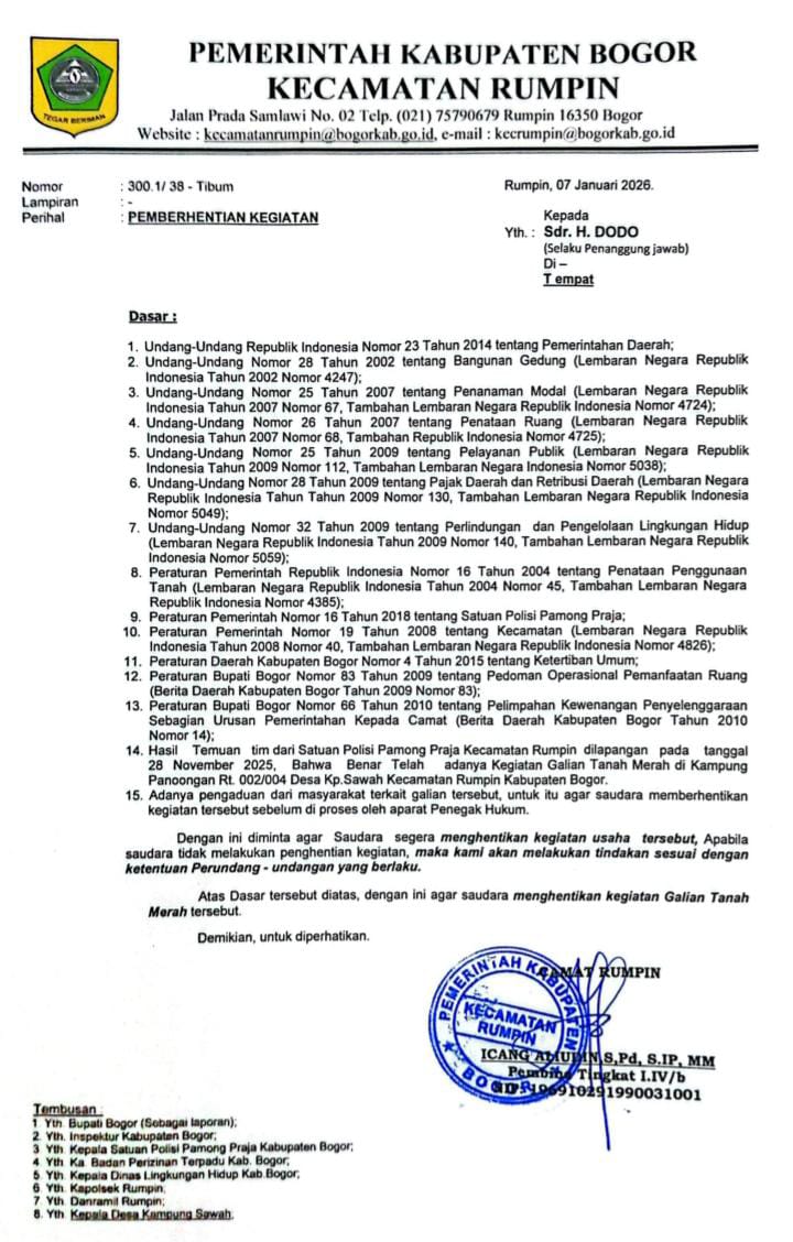 Kriminalxpost.com||Bogor – Aktivitas tambang galian tanah merah yang berlokasi di Ponoongan, Desa Kampung Sawah, Kecamatan Rumpin, Kabupaten Bogor, diduga masih terus beroperasi meskipun telah diberikan surat pemberhentian kegiatan oleh Satuan Polisi Pamong Praja (Satpol PP) Kecamatan Rumpin, Kamis, 08/01/26